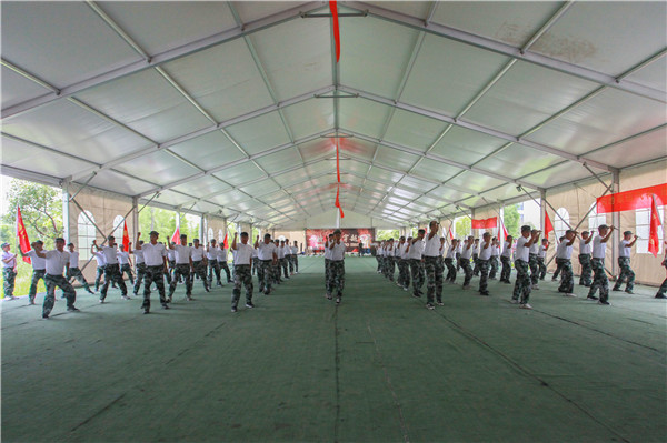 7月12日上午,軍訓開(kāi)營(yíng)儀式隆重舉行,集團人力資源部副總監兼精工鋼構人力資源部總監程弼先生、精工鋼構人力資源部副總監衛慧飛女士、集團人力資源部總監助理曾奇美女士及浙江紅創(chuàng )軍旅文化園副校長(cháng)鄭橋先生出席開(kāi)營(yíng)儀式。開(kāi)營(yíng)儀式上進(jìn)行了莊重的迎軍旗、軍旗下宣誓等活動(dòng)。